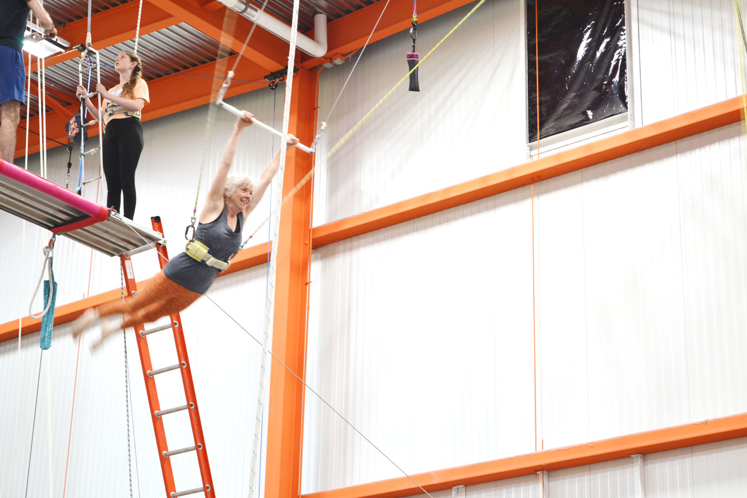 In the last half hour of class, flyers who are ready will be able to take their tricks across to a catcher (one of their coaches) swinging from a second trapeze.