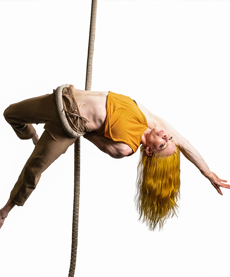 Her love of aerial has taken her all around the world—studying act development in Greece, busking around Eastern Europe, teaching workshops in Slovakia, performing on tour with Aerial Experience Productions and Paper Doll Militia, and creating multiple full length shows in NYC.